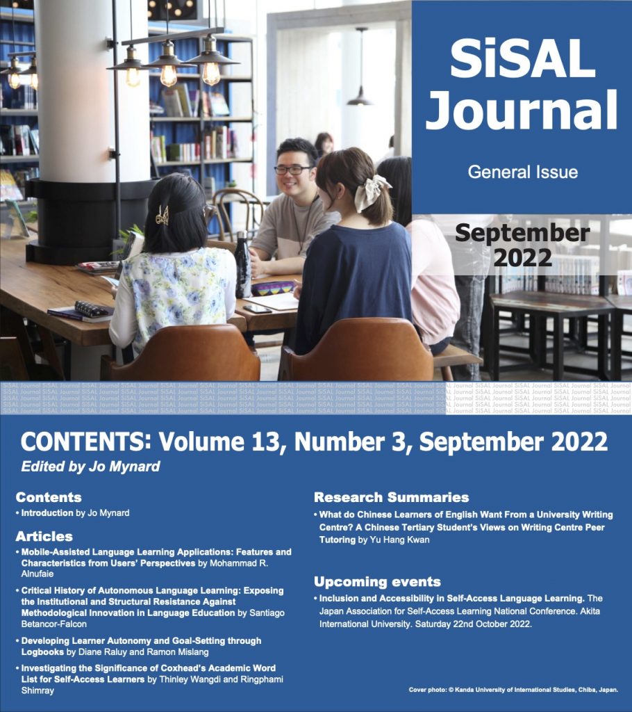 Studies in Self-Access Learning Journal (SiSAL Journal) was established in 2010 and is an open access, peer-reviewed, quarterly publication related to self-access language learning. The articles reflect the ongoing contributions to the field and are aimed at international researchers and practitioners. The scope of the journal incorporates self-access learning and skills support centres which aim to promote learner autonomy.